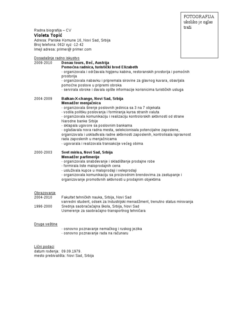 Kad je u martu prošle godine došao u Dohu da radi u poznatom franšiznom lancu restorana Mado Miloš Tadić iz Beograda nije imao snove o sticanju bogatstva preko noći. CV i drugi tekstovi. Potpuno besplatno možete da skinete i da se služite CV obrazcima.