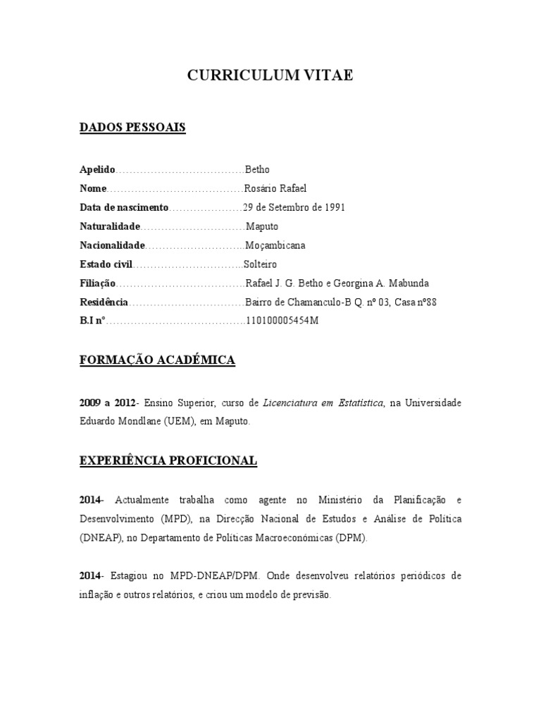 Curriculum vitae moçambique doc. Send your CV as one attachment in either PDF or MS Word format and remember to include certified copies of all your documents. Articles theses books abstracts and court opinions. When hiring candidates for the writers position we apply a very.